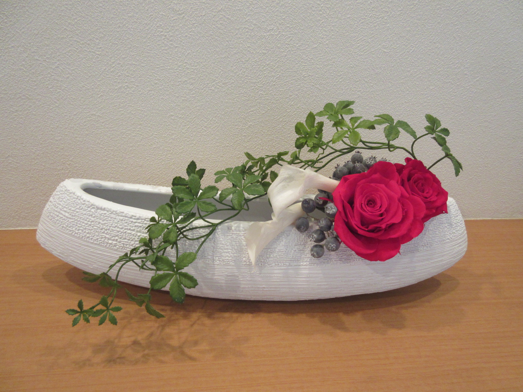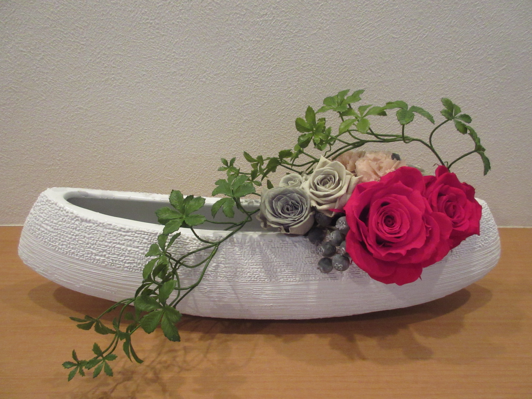 ちょっとアレンジ 10月5 玄関に飾っている赤い大輪薔薇のアレンジ。壁も花器も白くてカラーの存在感が薄いな~と思っていたので、お花を入れ替えてちょこっとアレンジ。赤薔薇が主役だから渋めの色を選んで控えめに。秋だしね。少し落ち着いた雰囲気になりました。 アレンジを作る時は、飾る場所も考えてデザインするのが鉄則❢の良い例になりました。