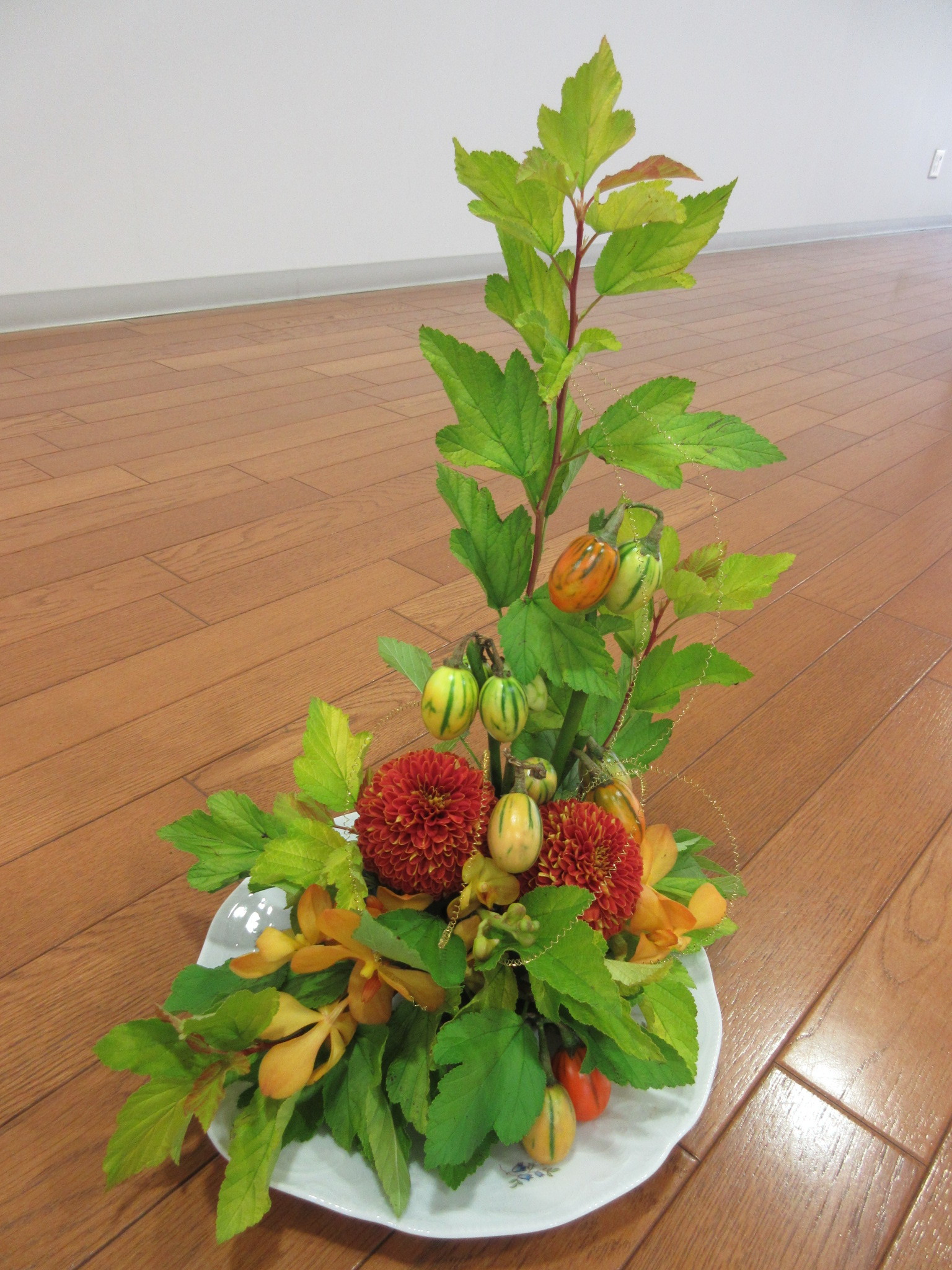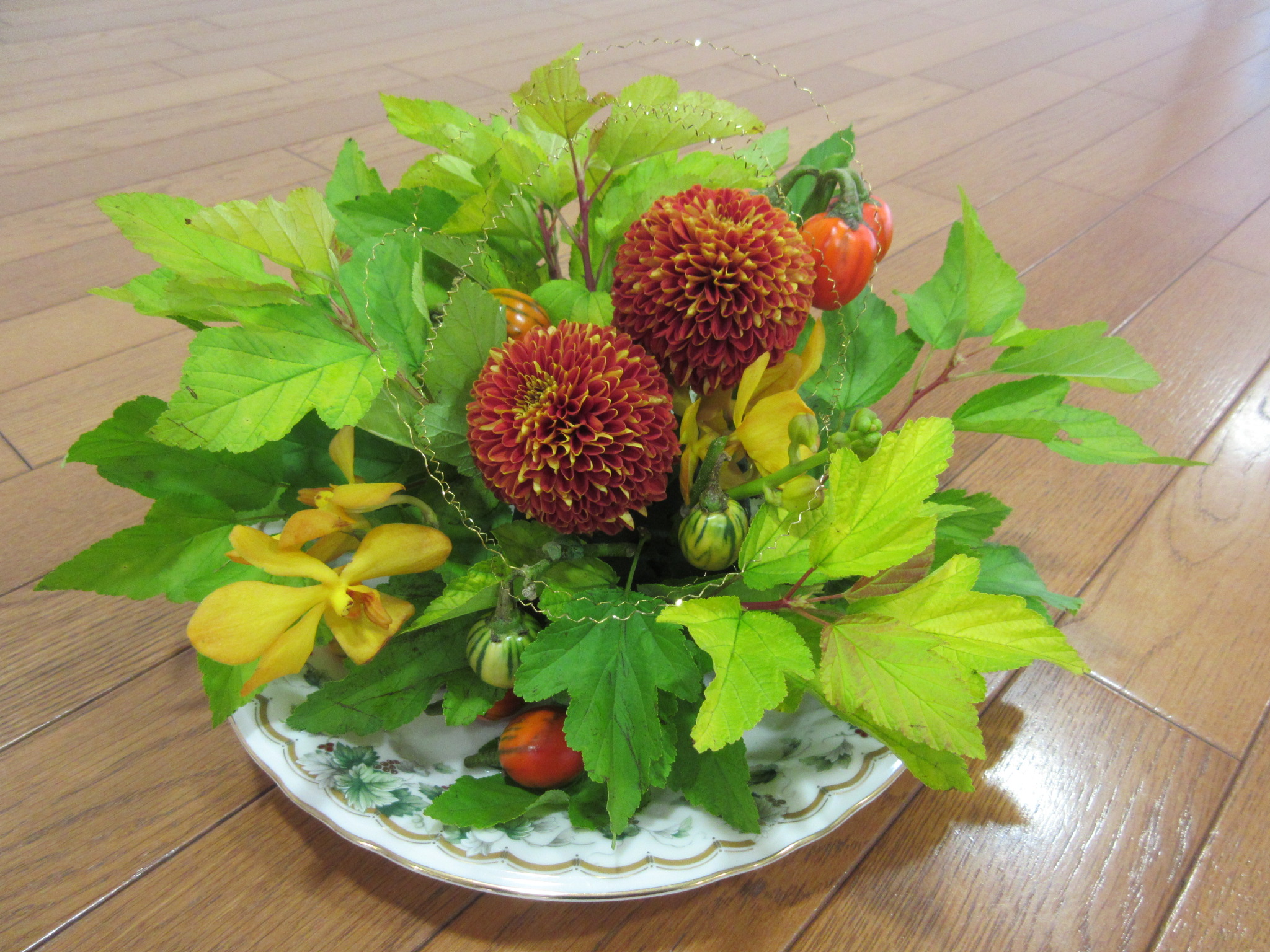 今回は気分を変えて柏のお花屋さん”moora moora”のお花を使ってのレッスンです。秋だしハロウィーンも近いし・・ということで、オレンジ系の花をメインに。
