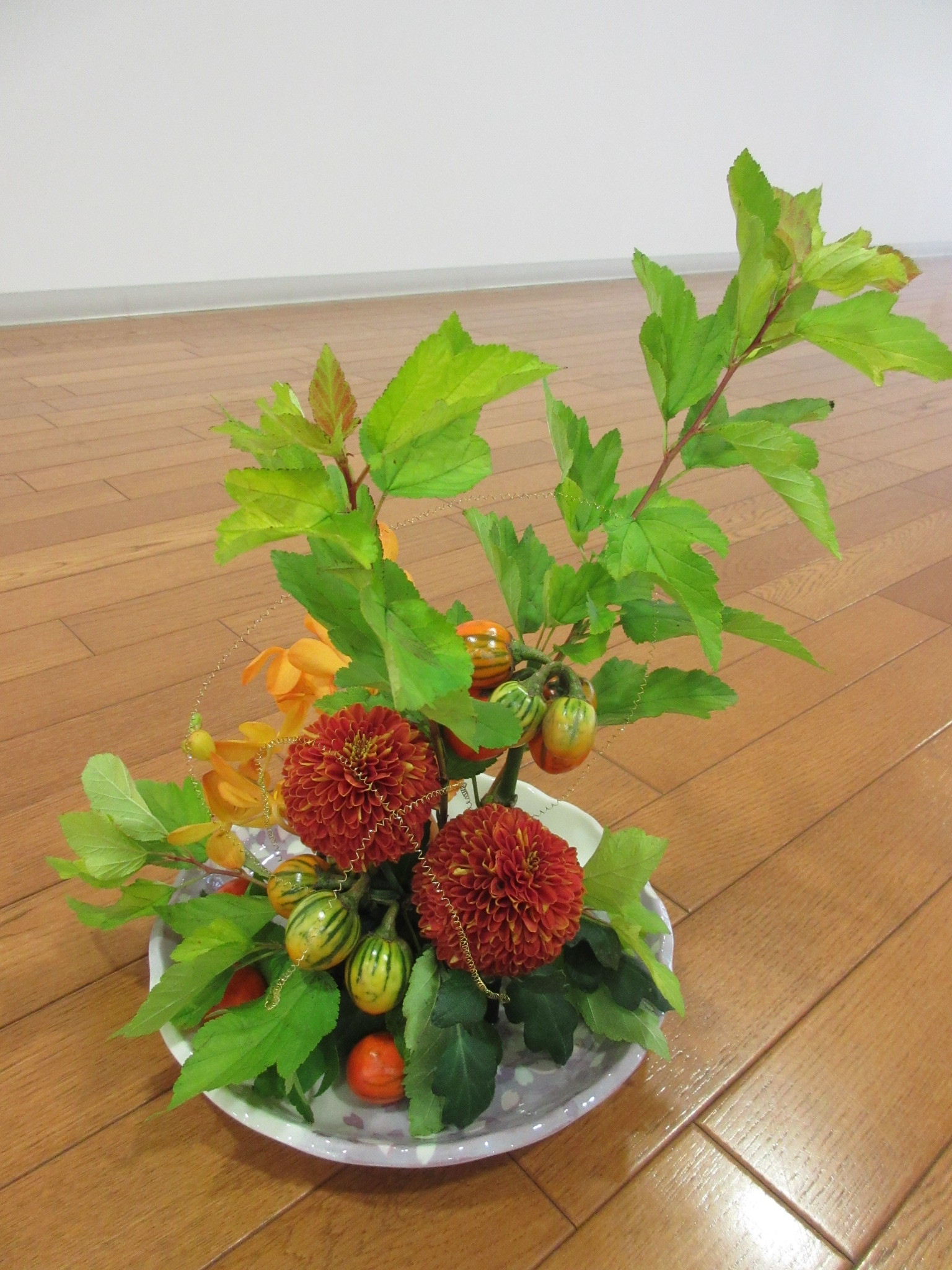 水が出てしまうので平皿にアレンジしていただきましたが、木のトレイやバスケットに生けたら更にナチュラルに秋っぽくなりますね。